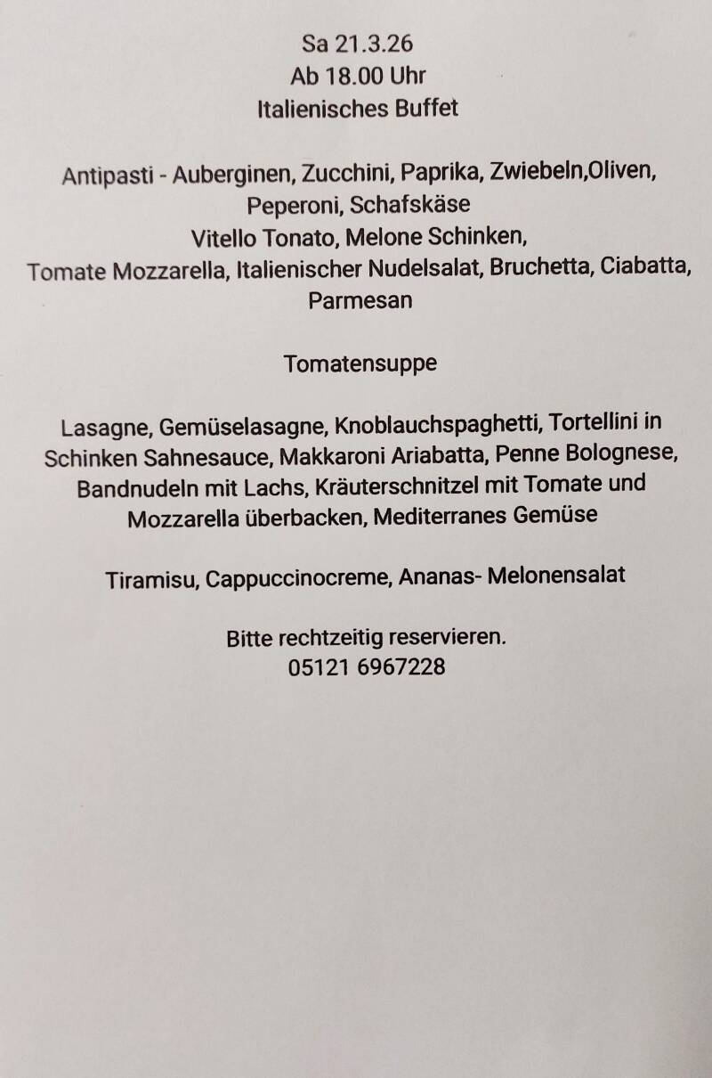Unser Buffet bietet eine Vielzahl von traditionellen italienischen Gerichten, von hausgemachter Pasta bis hin zu frischen Antipasti, die alle Frische und Qualität garantieren. Perfekt für ein romantisches Abendessen oder ein geselliges Beisammensein mit Freunden und Familie. Um Ihre Plätze zu sichern, bitten wir um Ihrer rechtzeitige Reservierung!